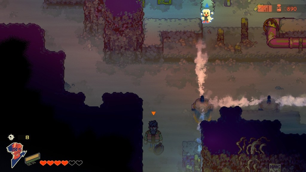 There are some aspects of Eastward that are user friendly. The menu has a section where you can view current objectives, and you can look back to the plot points of previous chapters in case you have been away from the game for a while. There is another section with a map, and it indicates where you need to go with a person holding a flag. I also like that there is an achievement section under the system tab. One issue I had was the minimal inventory space. Over the course of the game, you can purchase backpack upgrades, but by Chapter 4 I only had eight slots. For me, that wasn’t enough, as I have some difficulty with action combat and need more healing items. I opted to invest in as many S.O.S. items as I could, in addition to some healing items, as that item will revive you should you be defeated.