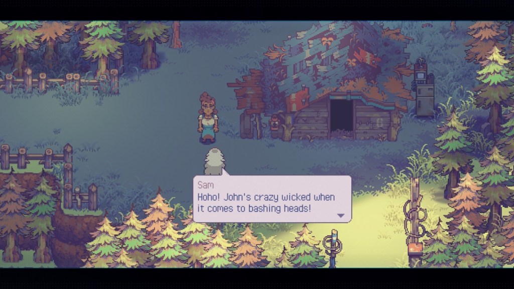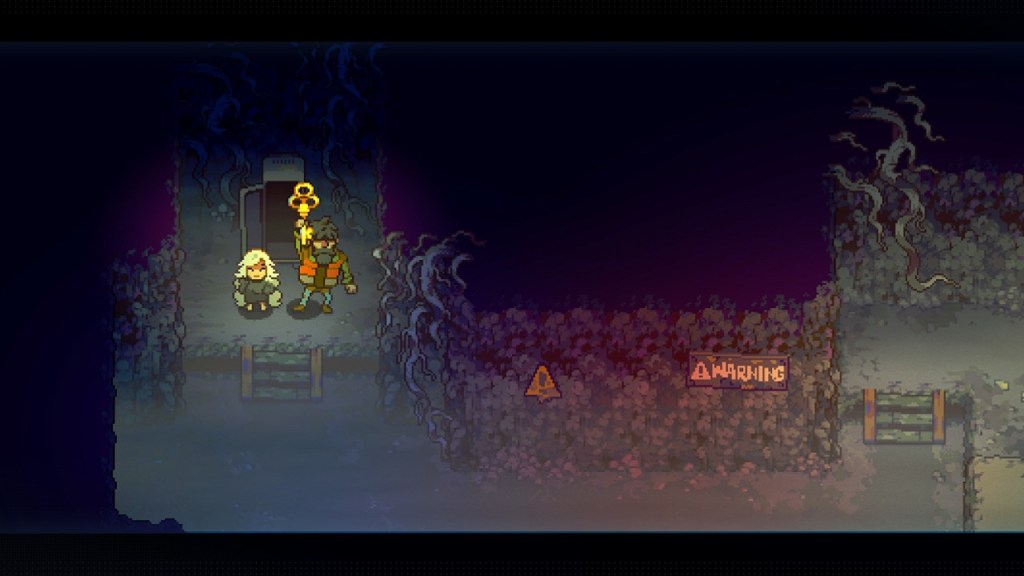 The graphics in Eastward are pretty muted; considering the setting, that’s not much of a surprise. I will say that at certain points in the game, the environment is too dark to move around easily – especially when being able to see is really important. There was a moment in Chapter 2 where I ended up dying many times due to an inability to see properly. While that was certainly frustrating, I ended up getting through it without an extreme amount of time wasted. Now, the character design is excellent in my opinion. My favorite design is definitely Sam. The characters are all very expressive in movement and facial expressions. I personally got some Gravity Falls vibes from the character design (John reminded me a little bit of Grunkle Stan in terms of appearance, and Sam reminded me a bit of Mabel in terms of personality). Some of the plot also reminded me of a book from 1995 called “Running Out of Time,” by Margaret Peterson Haddix. In that book, a young girl is raised believing that she is living in the eighteen hundreds; eventually, she discovers that things were not as they seemed. John and Sam leaving Potcrock Isle to go to the unknown world above made me think of that novel. The overarching plot in Eastward is rather dark, with the occasional frivolity sprinkled in. If it matters to anyone, there’s a decent amount of swearing here and there. I don’t know if this would be a good game for children, depending on the restrictions set by parents/guardians. As an adult, I’ve enjoyed the game.