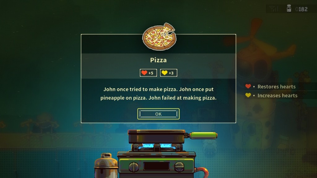 Besides the ability to play arcade games, in Eastward you are also able to shop for ingredients and discover recipes. This can be important for survival; some enemies can be pretty difficult and will quickly chip away at your hearts. Having food to restore your HP is a necessity. If you are defeated, the game’s auto save feature places you back before you were defeated. Thankfully, you also keep your items from before your defeat. You manually save your game by interacting with the refrigerator, of all things. It’s a quirky way of saving your game, so it suits the world of Eastward just fine. There is often a cooking station next to these saving point refrigerators, so if you see one and don’t have healing items with you, cook something up, as a boss fight may be ahead. Some ingredients can be acquired from treasure chests (be sure to purchase the Treasure Radar from a store in Potcrock Isle in Chapter 1). Other ingredients are occasionally dropped by enemies. Usually though, you get ingredients by going to the store. The stores will restock their items after events happen in game, so be sure to stock up as much as you can.