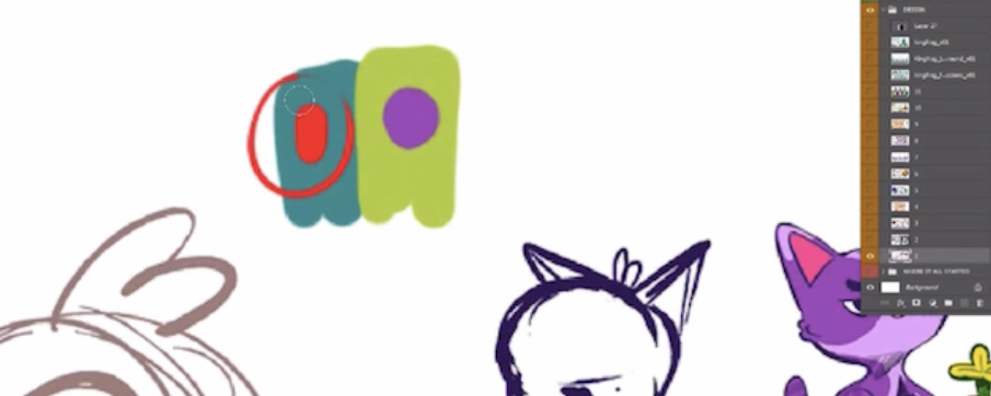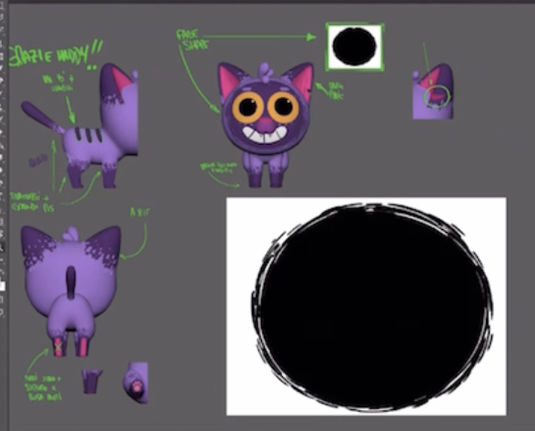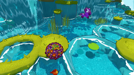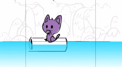 Frenzy: “The first idea was already a purple cat. And I’m gonna give you a very, very easy question…So, if you have a game that has got two elements, and we say that the elements are the water, and then you have the grass, right? You know that the fish is a red fish, right? So, you’re gonna have this nice red on top of the blue of the water, and that’s amazing because you have so much contrast here, and as soon as you see the screen, you see where the character is. …We had decided that the best color of the other character was the opposite of the red. It’s not exactly the opposite but it’s almost the opposite. And the color of it was very visible on grass…The purple of the cat is informed by the fact that we want every character to stand out.”