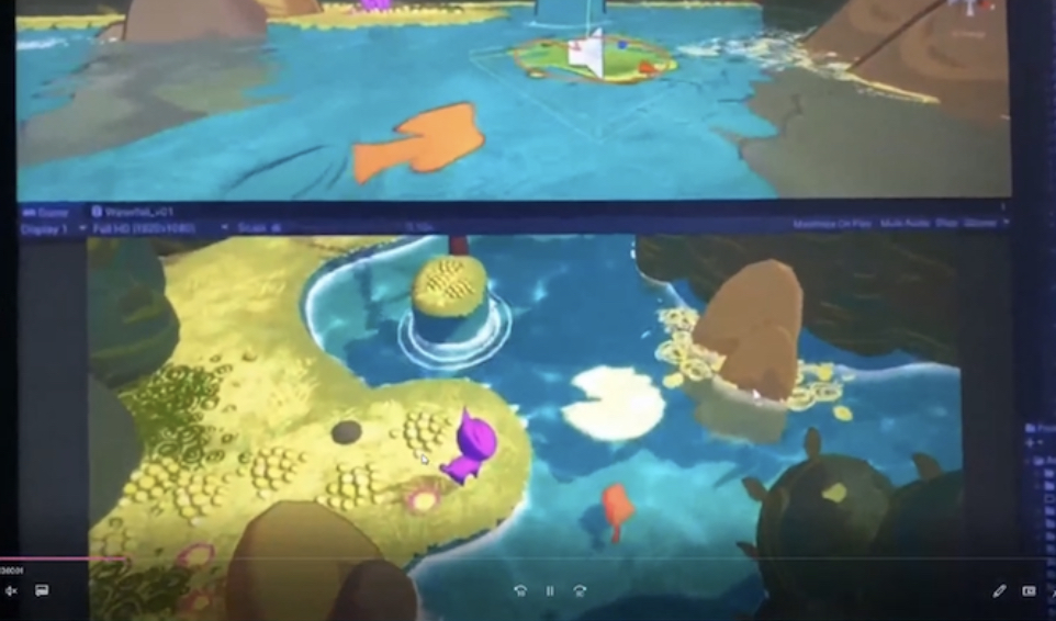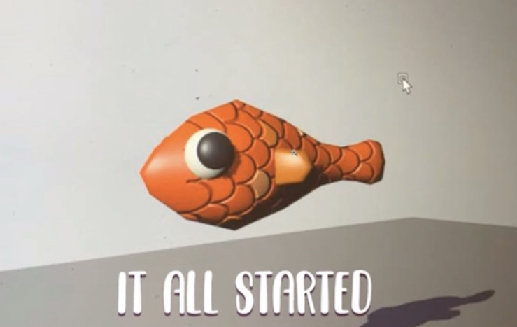Frenzy: “This is where it all started. So, you can see this really, really ugly fish. …This one was the first fish that we [did], and it was me and Gabriele…in a house in Naples. And we said, okay, we should make a video game. And we said, what kind of video game can we make? …and we were talking and said okay, let’s make a game about a fish. Why? Because we couldn’t afford to add any animation to the game, and the fish works even just by laying it in the water. …And yeah, this is where River Tails started.”