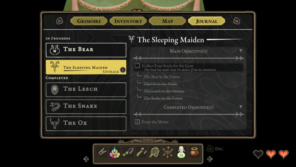 You have three hearts worth of health, but the game doesn’t involve fighting in the traditional sense. As mentioned above, you need to find enemies’ weaknesses and craft those items. Mosquitoes, for example, are weak against smoke pellets. You don’t use a sword against them, but instead engage in “combat” through crafting and setting traps, or throwing the items at enemies. You’ll craftily craft to combat your enemies. 😉 Some creatures can’t quite be defined as “enemies” in the traditional sense but still require careful maneuvering to harvest their ingredients, such as dog fur you snip off of a dog as they sleep. One major quest requires you to craft a puppet to lure away an enemy so that an accomplice can take them out. As someone with an extremely high sense of self preservation, I really appreciate not putting your character in real harm’s way. I liked the puppet function a lot, and wish it was included more because it was cool.