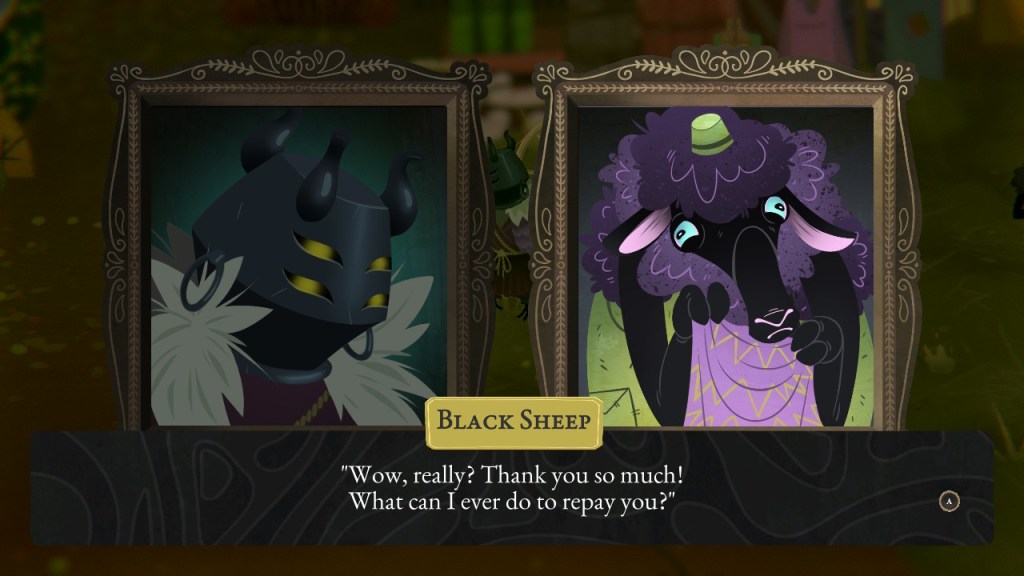 The twelve dark fairy tale scenarios in Wytchwood all feature malevolent creatures that commit acts of cruelty against the population. Some are worse than others – the cat, for example, commits acts of mischief that result in the town’s business owners turning against each other. Others try to take advantage of people financially, while a few even go so far as to commit murder. I liked the cat, ram, and stag quests the best because their quests weren’t quite as dark, and they had my favorite character designs as well.