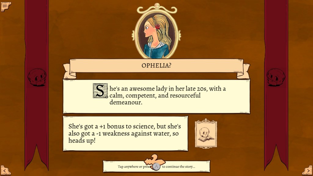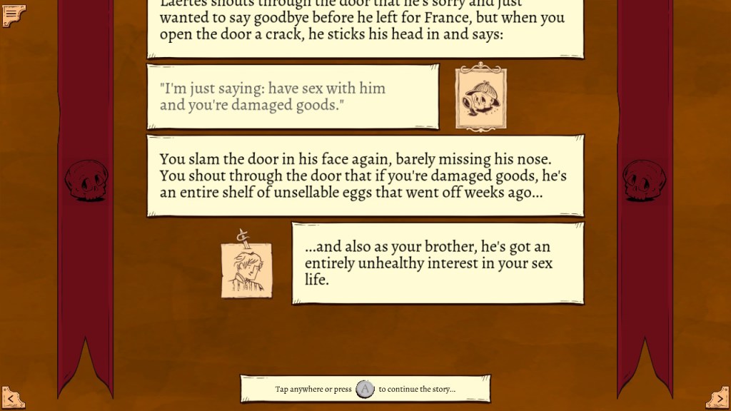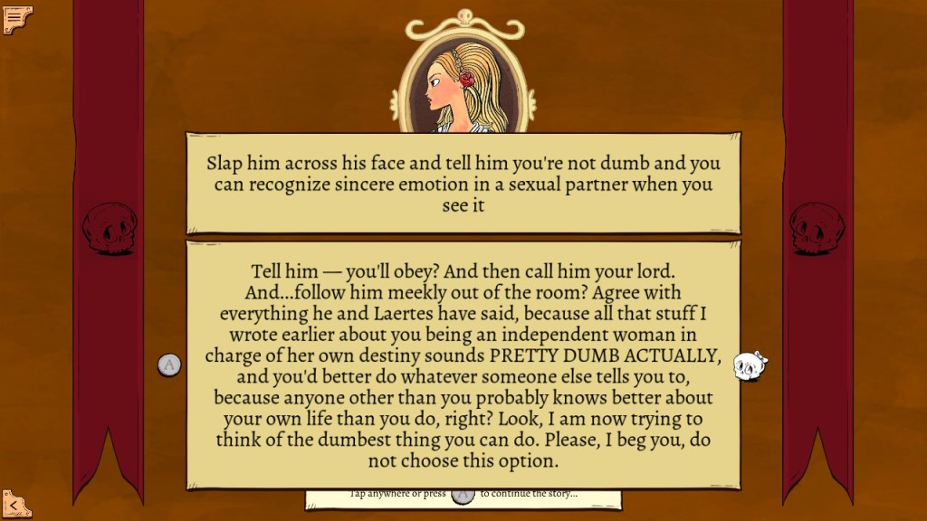In some of the storylines in this game, Ophelia acts as Hamlet’s voice of reason. There’s a decent amount of the writer (Ryan North) pointing out how sexist much of the original text was. The game is good at making you consider what would have happened if Hamlet’s characters had done things differently, and also reinforces that the chauvinistic viewpoints in the original text are not acceptable.