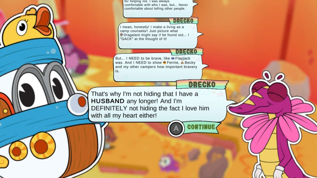 What’s really great is that there’s a decent amount of LGBTQ+ representation. I loved the gay stingray named Flapjack, who has a husband. There’s a jock who tried to hide his attraction to other boys by acting overly “masculine” and tough. It felt like a pretty fleshed out world, with multiple pairs of characters that know each other and that have conversations when you bring them back together.