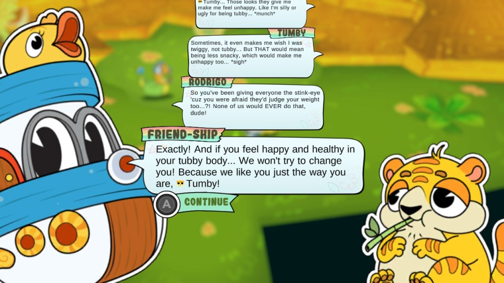 While the game does well in promoting positivity overall, I did think there were some missteps. For example, a character named Dippy requires you to purposefully make mistakes during battle in order to do any damage. I felt like that was kind of counterproductive to the overall message of the game, which is to not change yourself just to make others happy.
