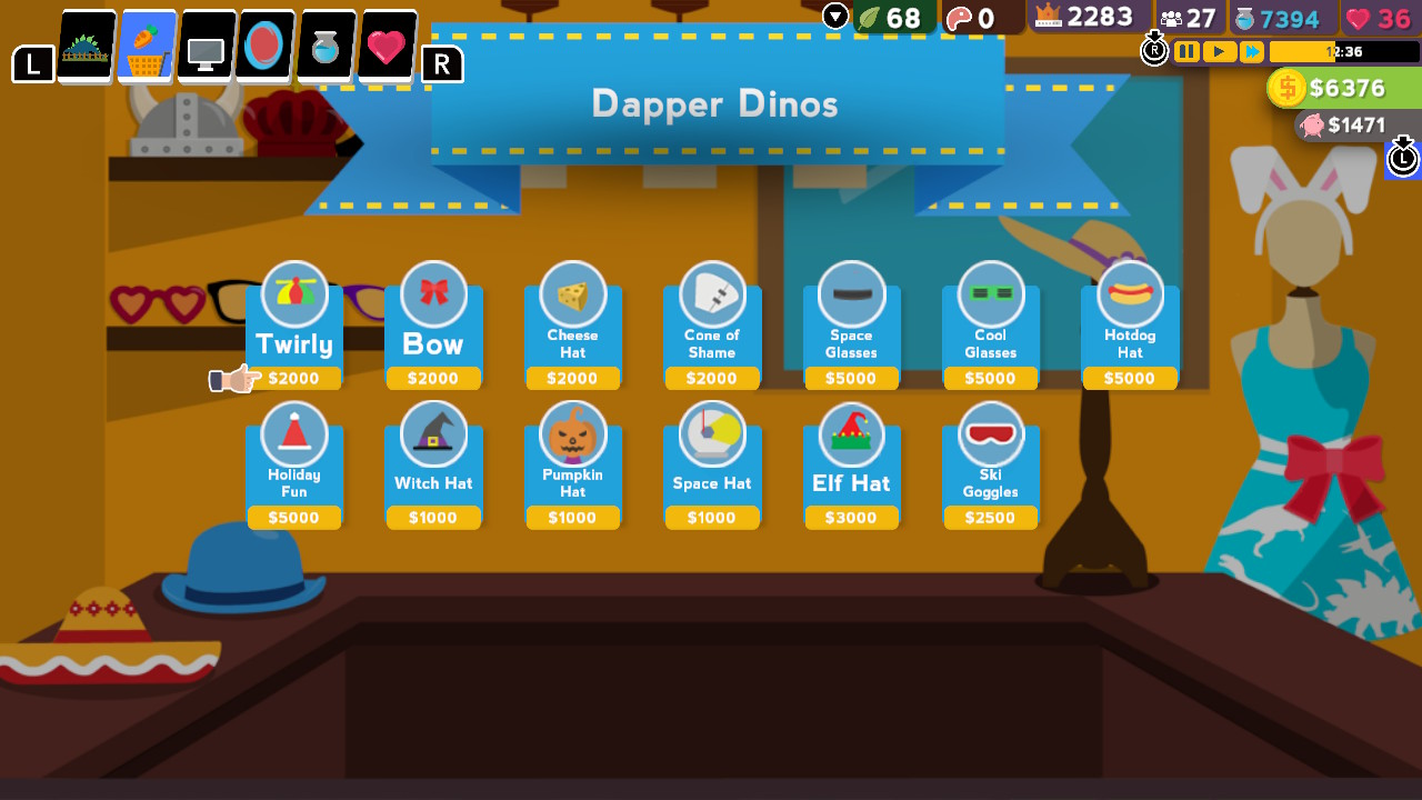 I did really like that we can place dinosaurs of different species in the same enclosure as long as they are all herbivores and they require the same biome. However, for those wanting to put dinosaurs together regardless of the restrictions, there are hats for that. 🎩 Each hat has a different effect; some will add to their visitor appeal, but others make it seem like a dinosaur is in the correct biome when it’s really not. There’s a hat that will tame a carnivore’s violent tendencies, one that allows you to use a smaller exhibit size for a dinosaur than they’d usually require, and more! You just have to wait until a dinosaur is old enough to wear a hat, then you can put one on them! (There’s a function that allows you to speed up time that can help a little with that.)