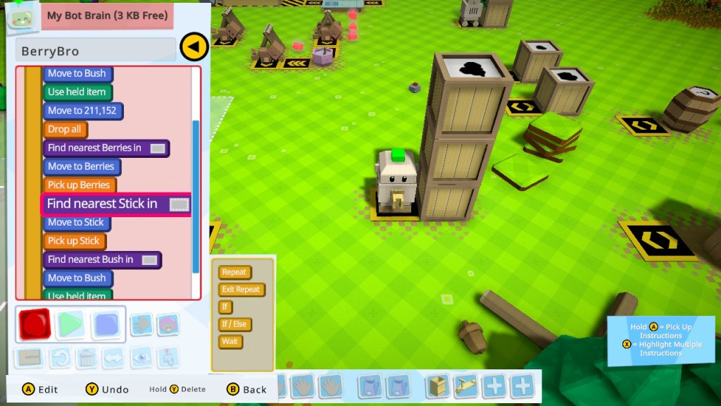 To program your robots, you need to get their attention and then start to “record”; the controls took a little while to get used to because you have to switch between the programming screen and your character to program tasks in. Once you’ve started recording, move your character around and perform the tasks you want the robot to mimic. The game will automatically “write the code” for the robot based on your actions. You may want to have a robot gather ingredients and put them in storage, or have them cut down trees and replant them. Each action will take up space in your robot’s “brain,” so the more tasks you add, the more room they’ll take up.