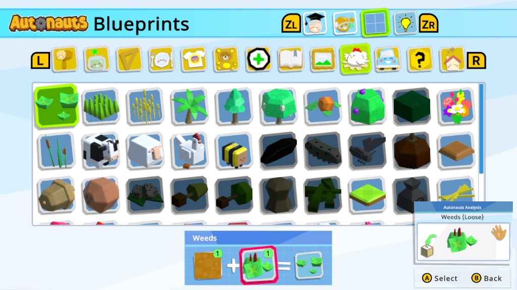 Unlocking more items through research will allow you to build better shelters for your Folk, which levels them up. When they level up, they need better food and materials in order to provide you with upgraded versions of “Wuv.” The improved Folk will also require clothes and entertainment – otherwise, they’ll refuse to give you any Wuv. I really liked the clothing options for the Folk, such as the “Plumber’s Dungarees” and the “Adventurer’s Top,” which have some clear inspirations behind them! 😉 There are also clothing options for your character. As you continue to improve your settlement and rise through the ranks, you can start an automated clothing industry to help with the Folks’ needs.