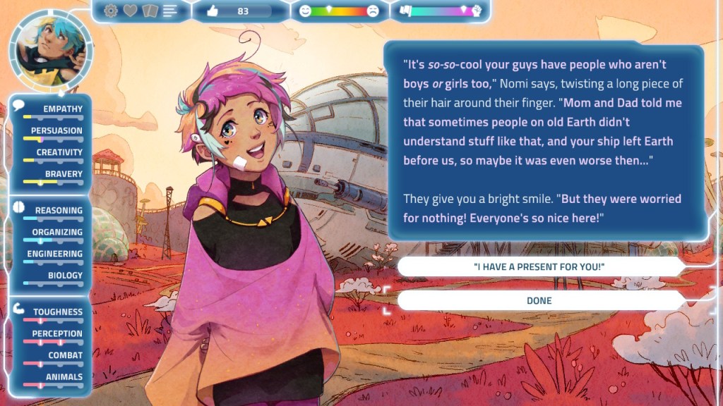 I really liked most of the characters in I Was A Teenage Exocolonist. Dys and the “secret” character were probably my favorites, as well as Tangent, Rex, and Nomi-Nomi. I liked some of the characters’ personalities when they were children but then disliked them as adults, or vice-versa. I also loved the character names, like Anemone, Tangent, and Geranium – or Professor Hal (it’s actually short for Halitosis – or bad breath 😂). It was cool getting to know the characters and watch them grow up. They all have their own unique personalities, interests, and gift preferences. Just be sure to save before speaking with them in case you make the wrong dialogue choice!