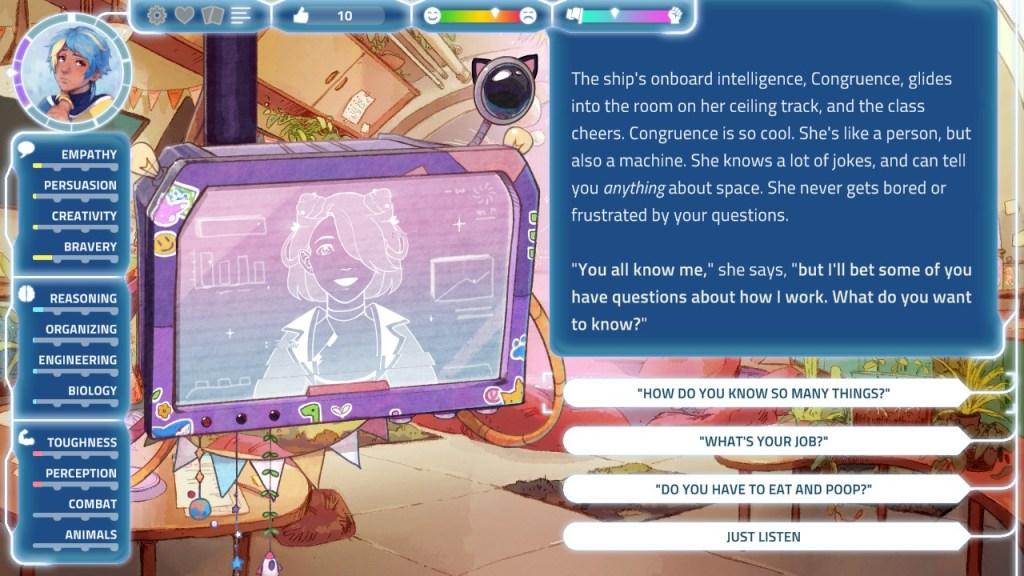 I thought they did a great job with the way they handled gender here, as well as the desire – or lack thereof – for children. One character was “assigned male at birth,” but there was apparently some technology that resolved her dysphoria and allowed her to live in a body that truly matched her gender. When speaking of your character’s changing body, the game asks if you have male or female parts – or even neither. I also really appreciated that each female character had their own individual opinions on children. A few were not interested in the slightest, while another was very enthusiastic. Some of these subjects may make some people uncomfortable, but it’s a natural part of life, and teenagers will be teenagers whether they’re on Earth or Vertumna IV.