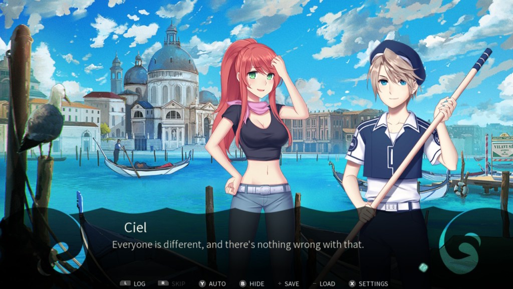 Now, the plot has you follow the story of a boy named Robin, who explains the myths surrounding Aquadine’s development for his job as a gondolier. His mother was an extremely popular gondolier herself, but she’s been hospitalized for the past few years, and now Robin is working to help pay off her medical bills. But Robin performs his job in disguise under a different name (Ciel) for personal reasons. Even his classmates don’t seem to know about his dual identities – perhaps due to his utilization of the Clark Kent effect by wearing glasses as Robin. As Ciel, he’s pretty popular – especially because he often sings on the canals. (The game is partially voiced, and they even play the song he’s singing in those scenes, which was a nice touch.)