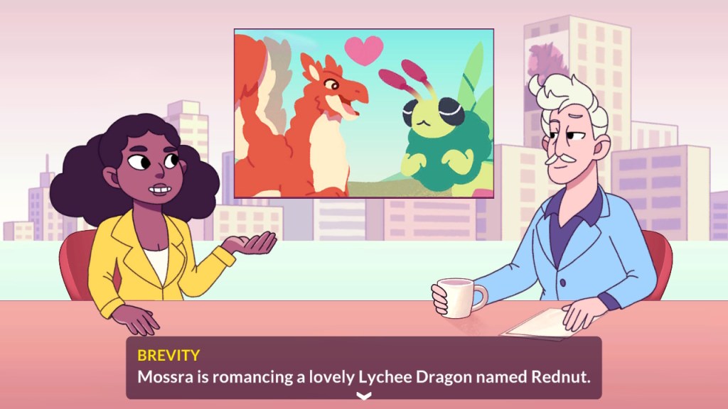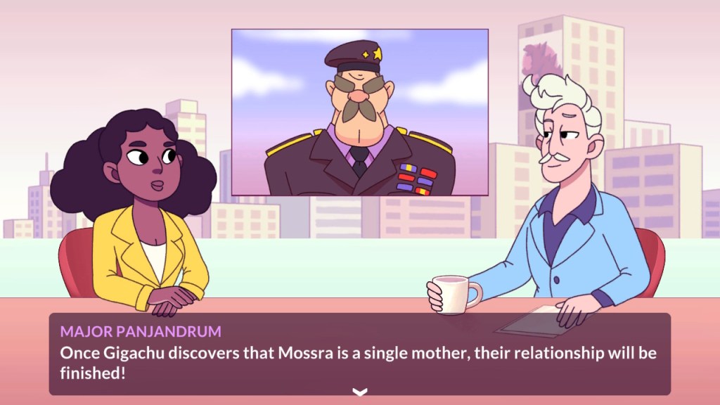 The game is partially voiced and narrated by two news anchors: Brevity and Lucky, whose show is appropriately and hilariously called “World Breaking News.” They are oddly invested in Gigachu’s love life (perhaps due to Lucky’s recent breakup), and use network resources to follow Gigachu the story. I enjoyed the clever dialogue and frequent use of alliteration. As the kaiju do not speak our language, it’s up to Brevity and Lucky to interpret what’s being said on Gigachu’s dates.