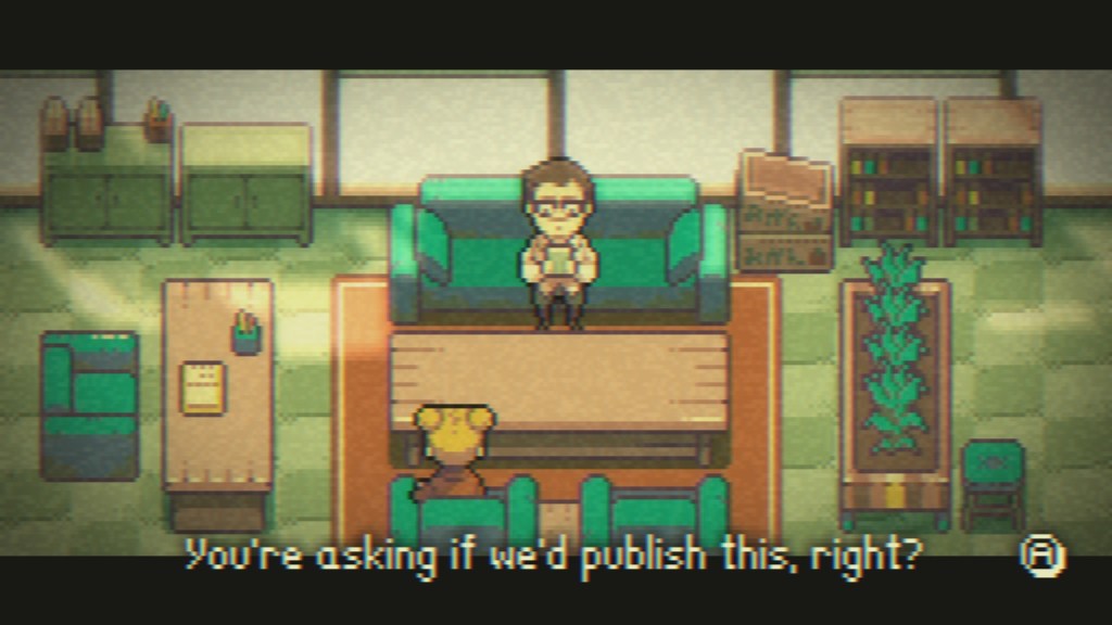 Outside of the Blocks portions, you’ll discover more information on Kanii and Kumade’s “developing” friendship and their work together. Kanii is their programmer, while Kumade produces the art for their games. The chapters are not entirely linear; they start in 2017 in the first chapter, then they go to 2021 and back to 2017 again. The story depicts the difficulties that developers face along the way. You need the right group of people as well as the time and funds to really work on the game. Kanii and Kumade demonstrate how conflict and indecision can negatively affect a game’s development and beyond.