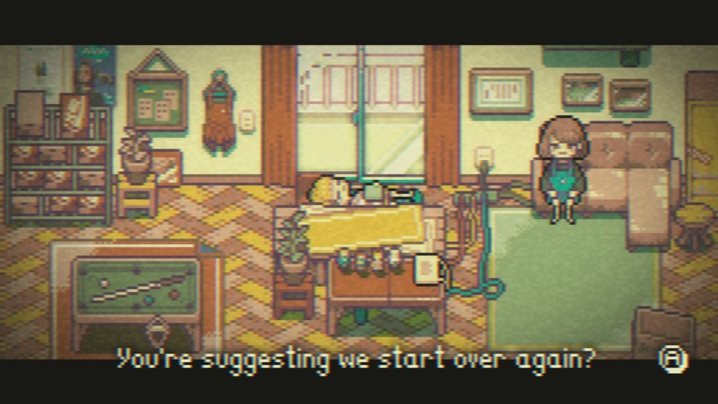 And once you’ve completed the game, you can choose to experience the scenes in specific chapters again, and you can replay that chapter’s stage again as well. Or, if you just want to platform without plot, select the bonus section and replay the Blocks levels. As I mentioned above, you only get three attempts at each stage in the main game. But in the platforming-only bonus mode, you seem to accumulate additional lives as you progress through each stage. You don’t get infinite lives, but you still have more attempts than you would in the “full” game.