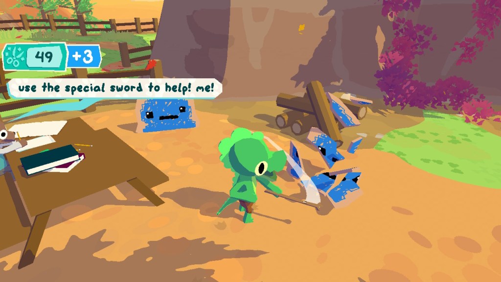 I was impressed by the variety of travel methods and the amount of items we can use to do the same thing. As the cardboard enemies can’t fight back, your shield will instead be used as a sled of sorts that will allow you to slide across the ground if you’d like. When you complete quests for certain characters, you’ll get ideas for new swords or shields or hats, so you can make them and choose to switch between items like a chessboard or a dinner plate as your shield/sled. There are timed challenges that have you ride around on your shield. I found those a bit difficult, but I don’t remember them being necessary to complete the game. What I really had some fun with, though, was swimming around the island as a cute little gator!