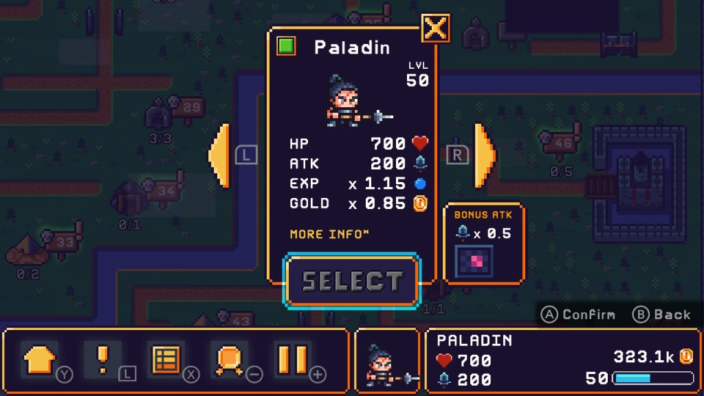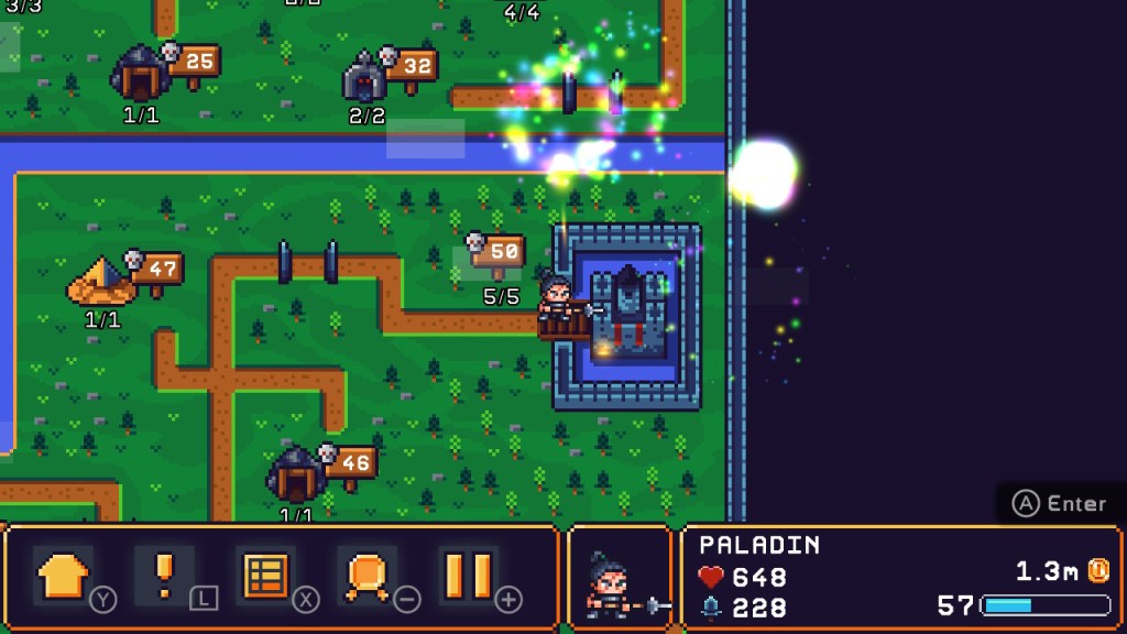 You’ll earn experience points and coins upon defeating each monster. (Coins are used for unlocking gates to additional areas with more dungeons.) If you level up inside the dungeon it restores your HP, which is nice because there aren’t any healing items or abilities for the most part. (An exception is the healer class.) You start the game as a mere adventurer, but once you’ve met some conditions (defeat X monsters or stay at the tavern Y times) you will unlock new classes with special benefits. When you switch to the new class, that class starts at level 1 again, but your initial class will maintain their levels.