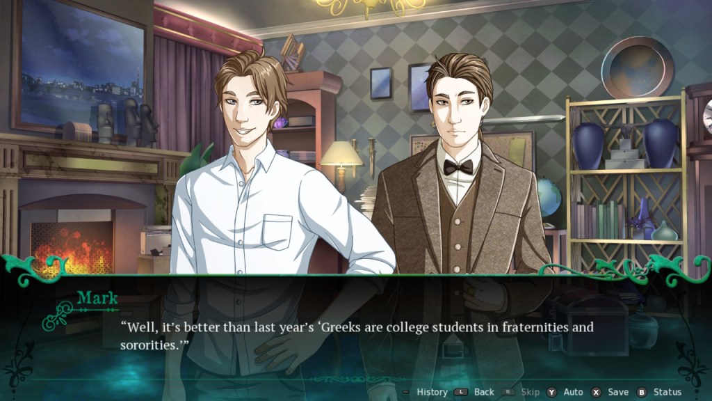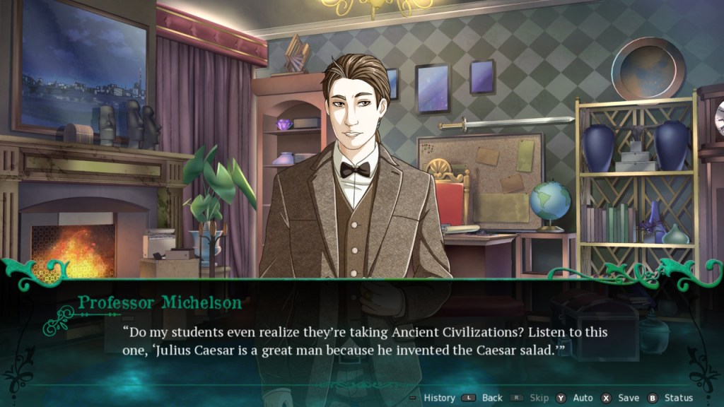 In this voice-acted visual novel, main character Mark Delaware is a teaching assistant for a history professor at a Catholic university in Colorado. He likes learning about history, and also enjoys learning new languages so that he can read historical documents in their original languages. Mark is about to graduate, and his boss/mentor, Professor Michelson, wants him to work as a translator for a group called the Society of the Arts.