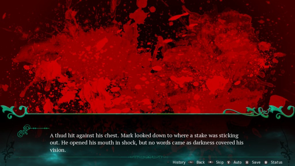 The story can end prematurely if you mismanage Mark’s relationships or his bloodlust. (You can view how your alliances and bloodlust are doing by pressing B to check your status.) There are multiple “Dead Ends” to Mark’s story, which occur when you are attacked and killed for some reason. Refusing to become a vampire after their world was exposed to you or killing humans because Mark forgot to feed are some of the many decisions that will result in someone killing you. There seem to be more Dead Ends or Bad Ends than Good or Normal endings. The first Good End I saw was rather short and not fleshed out enough for my tastes.