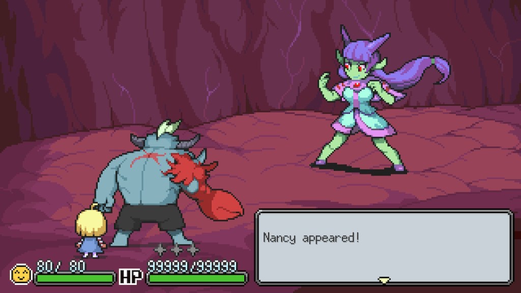 There are a limited number of plot-related battles and there are no random encounters. Sometimes there are mini game mechanics in and out of battle that require you to dodge or something, but I found the fights to be pretty easy; they mostly seem to be there for the sake of providing an environment that’s more likely to make Meg cry. While Roy protects Meg from any physical damage, seeing Roy get hurt results in emotional harm. Once her happiness meter hits zero, she cries and it’s game over. After each battle, Roy and Meg receive different kinds of stat increases, and Roy may learn a skill. If you lose, you can just retry the battle.