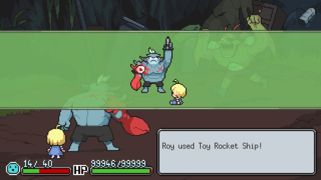 Once Meg stops crying, another ogre comes along because he could smell her and wants to eat her. Roy chooses to fight that ogre because he thinks he wants his “Magic Tar,” not realizing he wants the human. The good news is that Roy has 99,999 HP and has really high defenses. (Golan doesn’t participate in battles.) Due to Roy’s already amazing capabilities, you won’t have to grind at all.