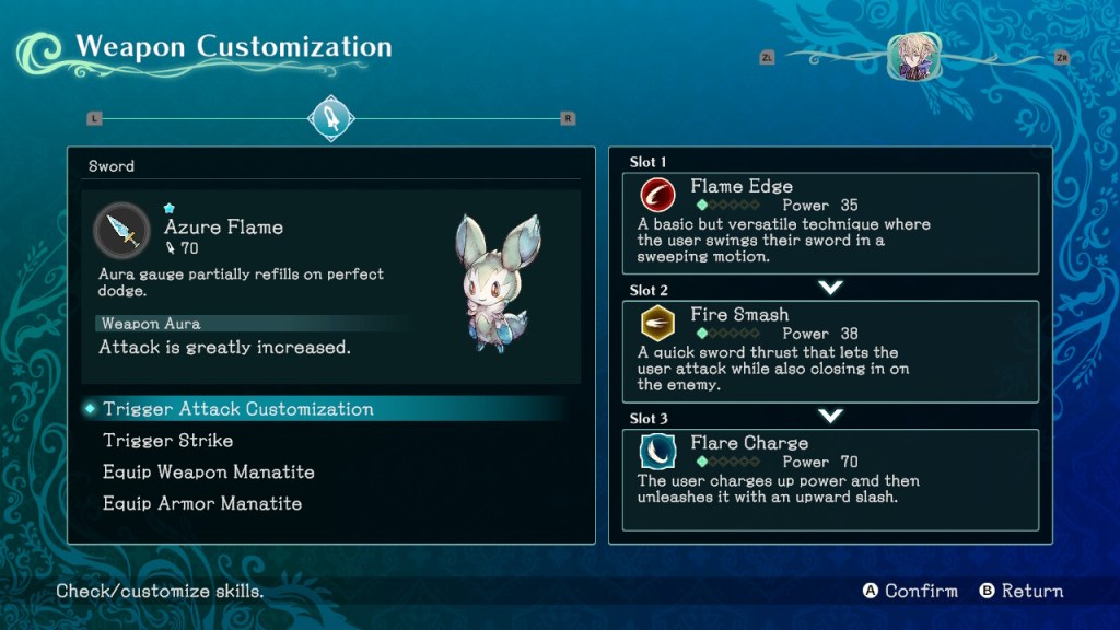 Characters’ “regular attacks” actually consist of customized combo abilities for each weapon a Trigger has unlocked. Weapons have three ability slots with two options each for you to choose from; you use the TP you earn to unlock the abilities you want to use for each weapon. These abilities can also be leveled up using TP.