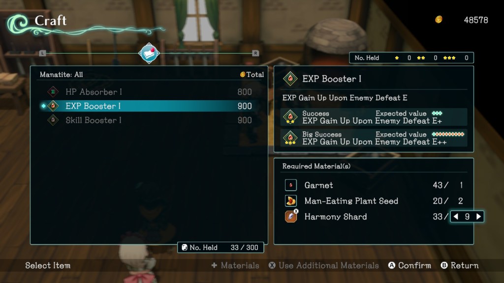 I did wish we could modify existing Manatite and add effects to them, though. It doesn’t seem like you can choose what effects are added to the Manatite you craft, either. (You can also craft healing items, but unfortunately they limit your inventory to 10-20 each.)