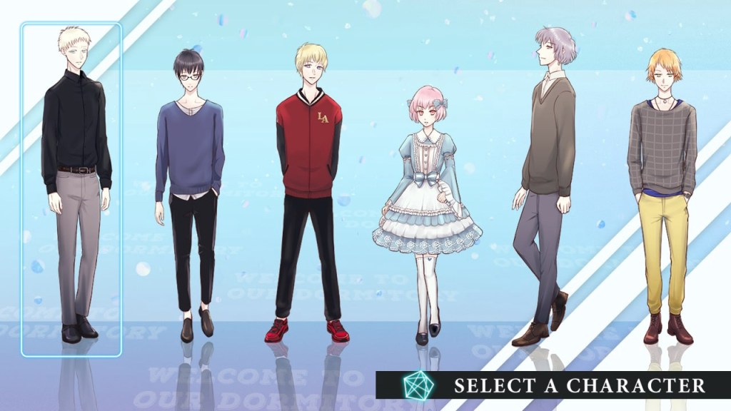 As this is an otome game, naturally all of the dorm residents Jun interacts with are guys. There are 6 of them, each from a different country and with different interests. After the brief prologue introduces the basis of the plot and the love interests, a fantastic animated opening plays with its theme song. Again, I was so amazed by this indie otome including something that I usually only see in otome from larger companies. The video lasts nearly 2 minutes! 😮