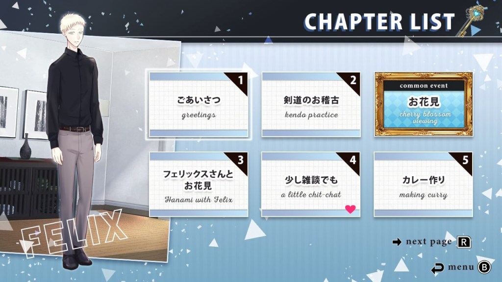 There are some jokes here and there about everyone marrying Felix for his culinary abilities, which I thought were pretty amusing. He has a lot of different and interesting hobbies – one of which is learning about tea ceremonies. The brief discussion of tea ceremonies was really interesting to me. Although there were some fascinating cultural tidbits in Felix’s routes, and I didn’t mind him too much, he did come off as a little bland; it seemed like everything he did was perfect.