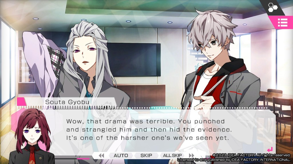 The common route could feel a little scattered, with a combination of: a handful of dramas acted out, investigations, chores, arguments, getting to know the other cast members, and a few leisure activities. I think that with the common route being on the shorter side, they also really overused flashbacks – especially the ones for scenes that pretty much just happened.