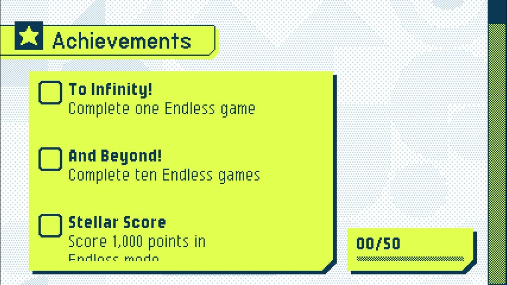 My scores started out pretty mediocre until I got used to the game. I wouldn’t say I’m amazing at it, but I found myself getting better with each play, which was incredibly satisfying. There’s also an achievements feature that shows how far you’ve come, and a stats section that you can unlock. I just loved making progress and unlocking new parts of the game even after making mistakes. Everything gets unlocked at 300,000 points.