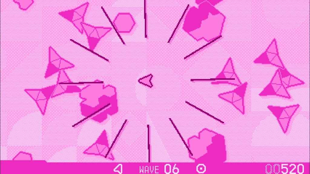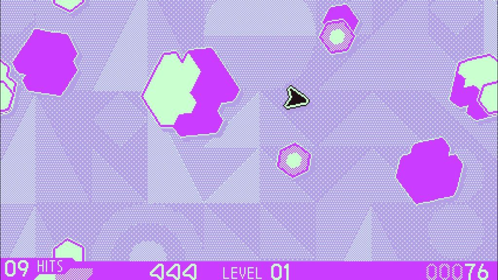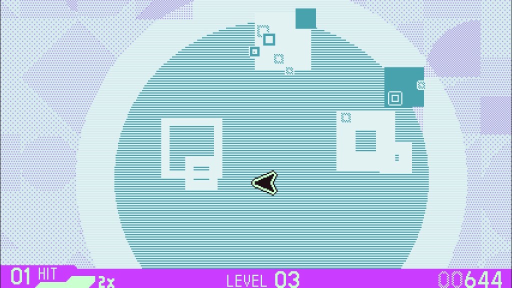 The graphics are simple but effective; your ship is a little arrow cursor, and the “enemies” vary in shape and size. Their commonality is that you must only hit the shapes on their light side – hitting their dark sides results in losing a life. When you move around, you have to be careful not to accidentally bump into those sides, which can be difficult when going offscreen takes you or the enemy to the opposite side of the screen.