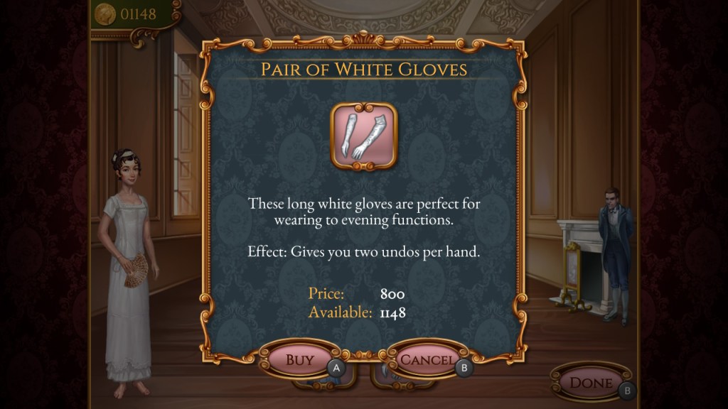 As far as the Solitaire gameplay goes, I had a good time. I appreciated the way that they allow players the choice of making things easier or harder for themselves. Adding the Regency storyline and incorporating the story items into the game certainly make the game more interesting. I found it really creative.