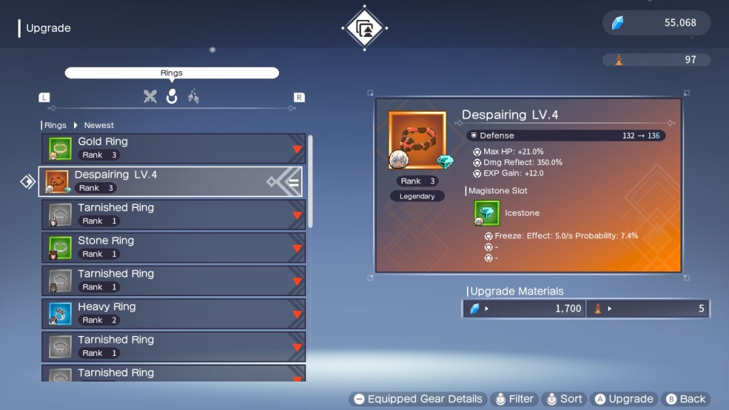 You can customize and upgrade your equipment to strengthen your character(s). Items called Magistones have elemental affinities and bonus effects such as increased attack/defense, experience gain, or faster skill cooldowns. Magistones can be swapped out as needed without losing them. Upgrading your equipment seems to only increase their attack and defense stats but not their effects. I liked managing my equipment, although it was inconvenient to only be able to change it at the base’s storehouse.
