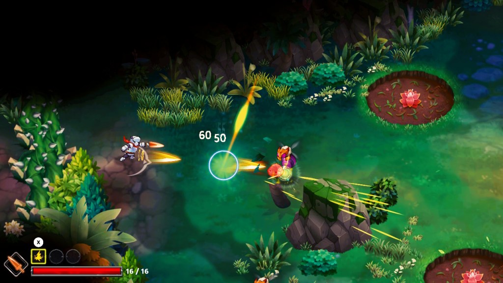 Monsters generally project where they’re going to move and attack. They aren’t the only factor you have to worry about, though – environmental hazards such as fireballs, quicksand, or swamps with spikes can damage you, too. (Ignoring their status as a nuisance in battle, the water lilies were lovely!)