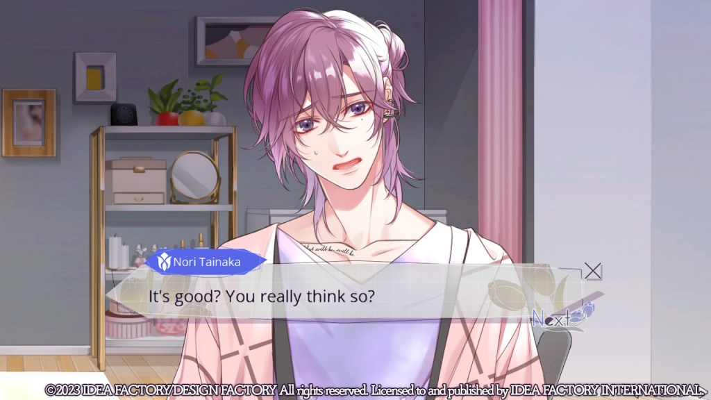 Overall I actually liked the dialogue; Akari’s just could have been handled better. The only major issue I had with the writing was the way they included flashbacks of things that had just happened. Design-wise, I liked how big the text was, and it seemed like they included more dialogue choices than other otome.