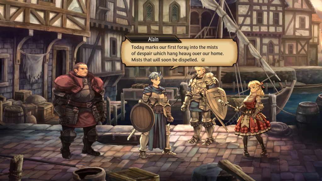 I really like the character animations and the English voice acting. The benefits for placing different classes in certain formations are pretty neat, and it’ll be fun to see how things play out when you accept or reject a character for your party. The Rapport system sounds similar to the supports in Fire Emblem games, and there are town (re)building elements in the game.