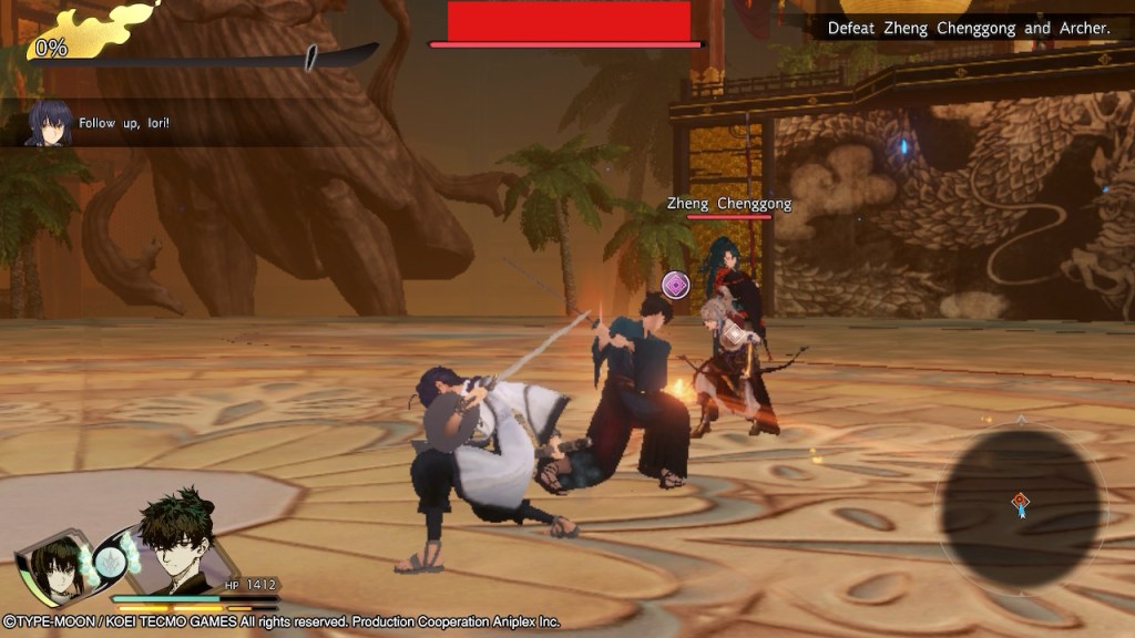 Since they’re the focus of the main story, I started with Iori and Saber. “Boss” says that you must win three matches, so you don’t have to face each team yourself. The action combat is the same as it is in the main game, with opponents’ Shell Gauges to whittle down, Magecraft, stances, Affinity Techniques, the Valor Gauge, and of course the Noble Phantasms.