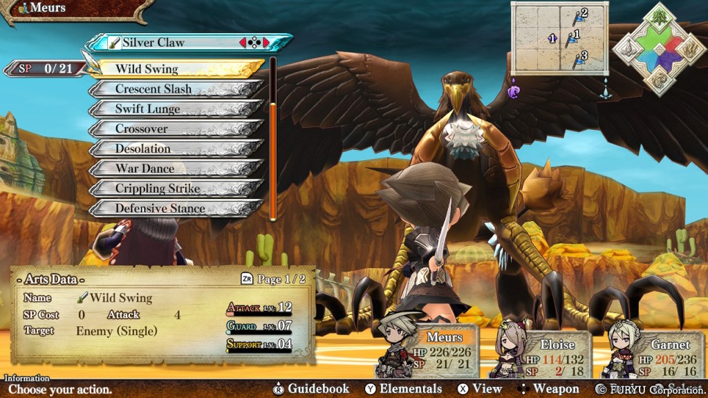 You can equip your party members with any weapon type you want, although I would assume that some work better than others for each character. At the start of each turn, you must choose your party’s battle formation, which impacts each characters’ stance. Battle formations can place your characters in any combination of attack, guard, or support (speed) stances.