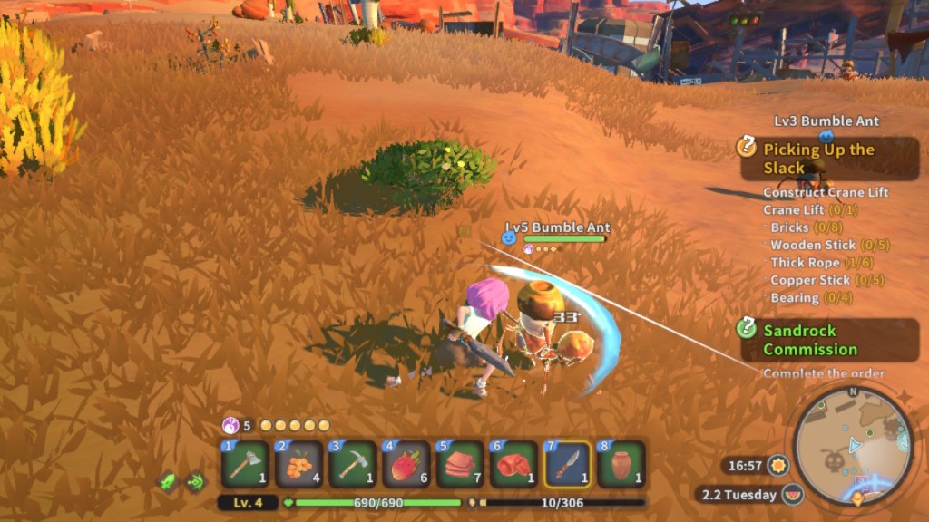 For me the game gets off to a slow start, but once I got used to the mechanics again it started to pick up. You only have access to a limited amount of lower level materials at first; there are some small rocks, bushes, and trees in the immediate vicinity of Sandrock. However, you aren’t allowed to cut down any trees that close to town due to the aforementioned lack of foliage. You must settle for chopping up deadwood instead.