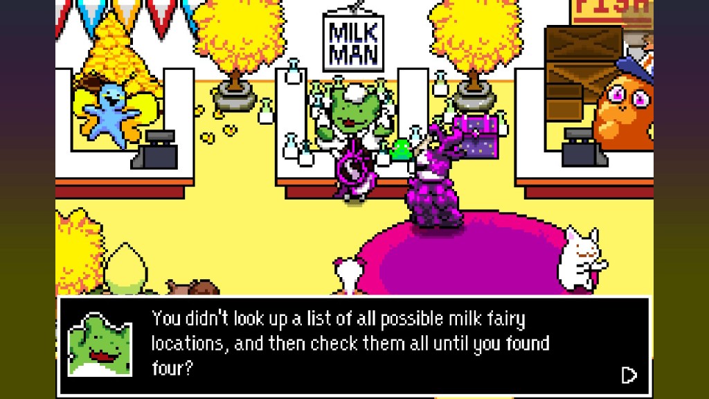 Return to the shop on Olympus and give the Milk Man frog the 4x blessed milk. You get a Milk Badge to use on your character or one of your party members, it seems. But I’m not sure what that does. I thought that was the end of it but my Rhapsody said I didn’t finish it so there seems to be more to the quest.