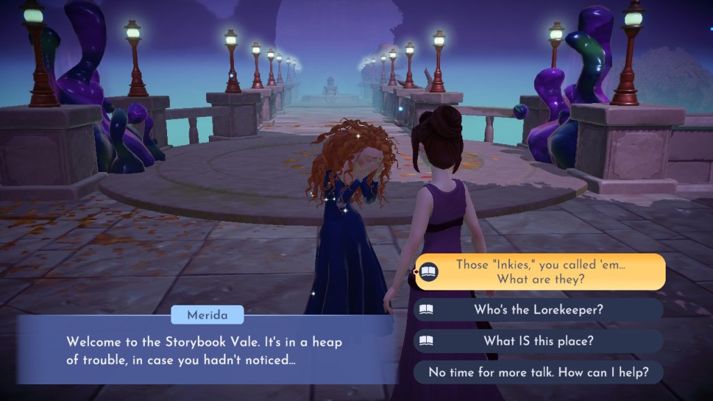 So Merida is the first character we encounter in the DLC. Her gestures and expressions are pretty hilarious. She introduces us to the Storybook Vale and its Lorekeeper, who says the Vale is “the place in your heart where your favorite stories live.”