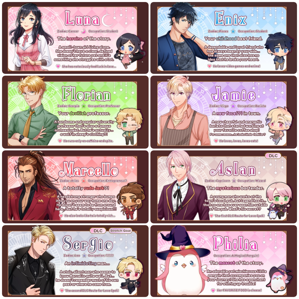 Love Spell: Written in the Stars is described as a romantic comedy visual novel. Its heroine, Luna, doesn’t know what she wants to do with her life, and her love life isn’t going well, either. One day she saves an old woman, who rewards her with a magical book with the power to make someone fall in love with her until the next full moon.