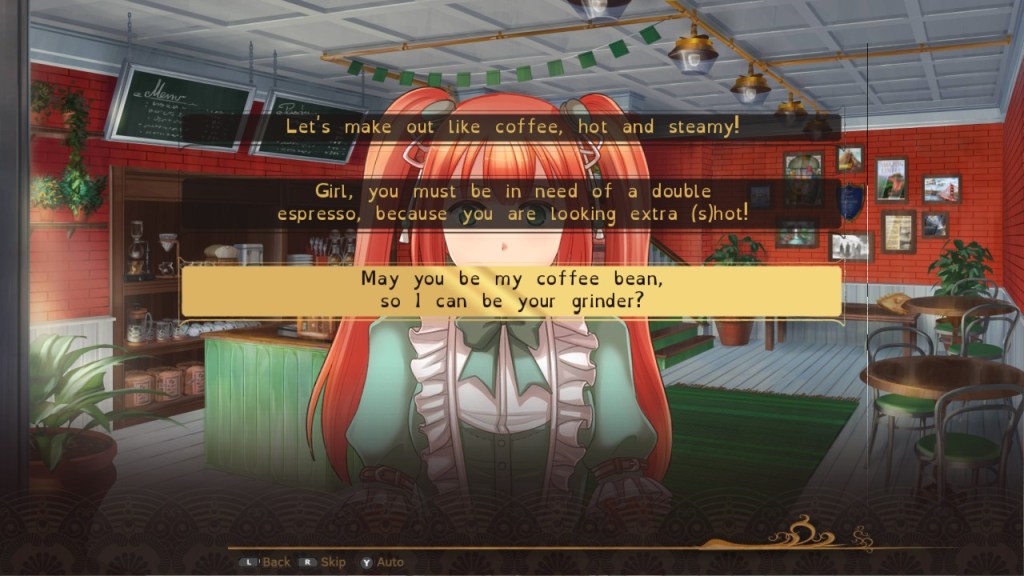 Funnily enough, I don’t like coffee (or tea, for that matter), but some of my favorite visual novels still involve that beverage. Caffeine: Victoria’s Legacy has a really intriguing premise: a young man named Taka is transported to a land where coffee is king. People use the power of caffeine to cast spells there. They do a great job establishing the setting and background of the land of Victoria. It’s a lengthy visual novel with 450,000 words and romance.