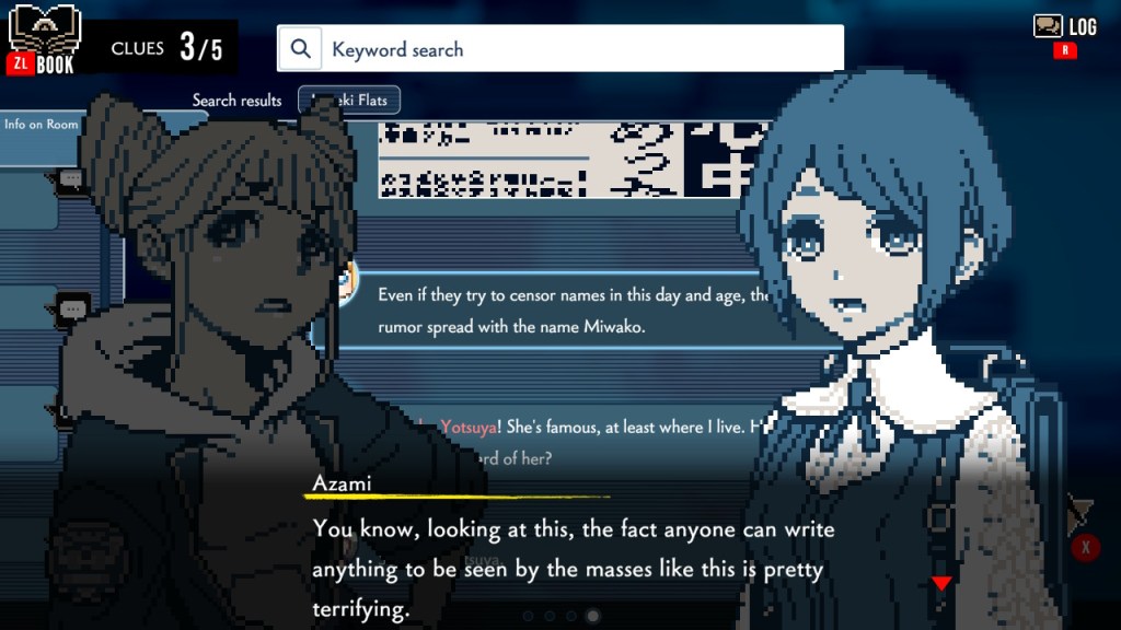 On the way, she explains how they must first gather information on cases by checking social media for details – such as the source of the rumors that generate the urban myths. By putting on her new glasses, Azami can determine which key words should be used in additional searches.