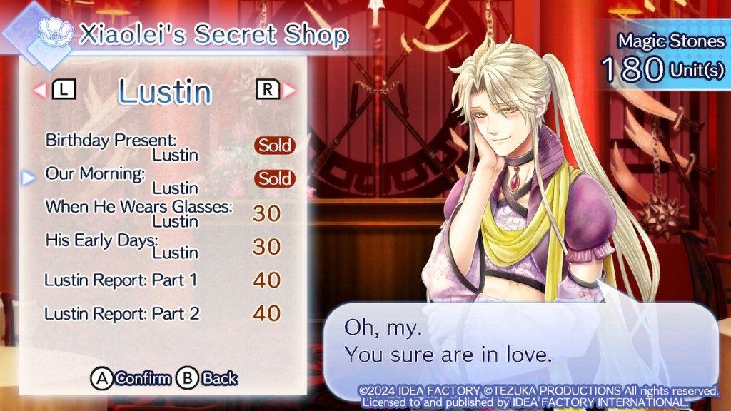 Completing the story for the first time by viewing the happy ending unlocks the secret shop, where you use your magic stones to purchase bonus CGs and short stories. I usually view bad endings first and then the happy ones, but I’d assume that there are some players who only like to experience the happy endings. This system is a nice incentive to view everything the game has to offer.