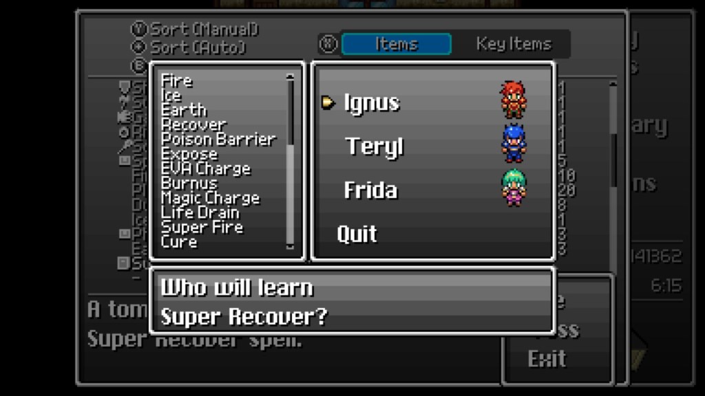 Your characters don’t learn magic as they level up; instead, you’ll have to find/purchase magic tomes to teach them new magic. There is a limit to how many spells you can teach each character, and they can only equip 4 spells each to use in battle. (However, you can still use any unequipped spells – such as healing – outside of battle.)