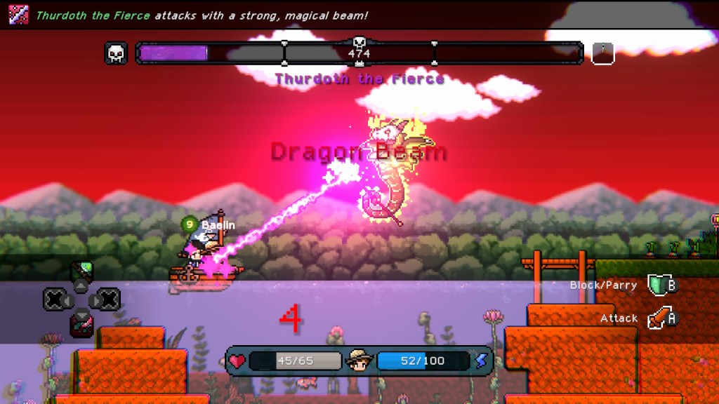 Baelin has a stamina gauge and a health gauge, and when the fish attacks you you’ll have to block or parry their attack to reduce the damage to your HP gauge. The edges of the screen switch from blue to red and back to let you know when it’s safe to attack. You can sacrifice some stamina to use spells that will decrease the fish’s HP and/or cause a status effect such as bleeding.