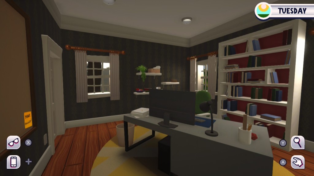 - Dolly: dust bunny, click on sofa with glasses off and she’ll appear on the floor next to it on the fireplace side