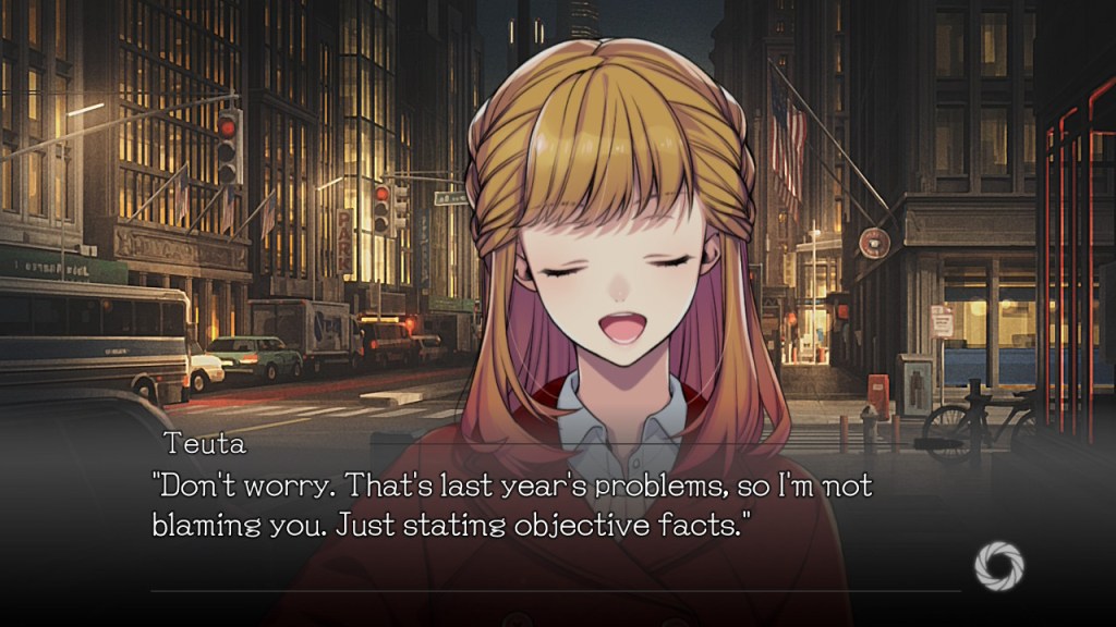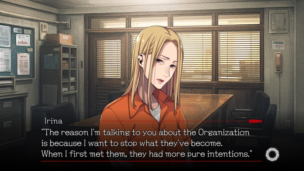 In the common route portion Teuta splits her time between writing articles and helping the guys with jobs. A prison inmate specifically requests Teuta for an interview, and she tells her about a mysterious (and shady) organization she’s worked for; the woman wants Teuta to investigate the organization and expose them. Sounds dangerous, but Teuta is ambitious and curious enough to look into it.